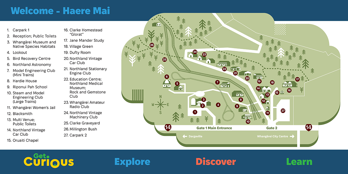 Other heritage buildings moved onto the park include the unique octagonal c1860s Oruaiti Chapel, the original jail cells for the women of Whangarei c1900, Riponui Pah School c1898, and the roof turret of another early Whangarei homestead, “Pukenui”, built by ‘timber king’ Francis Mander in 1906. His daughter, the renowned early New Zealand author Jane Mander, used this as her study.